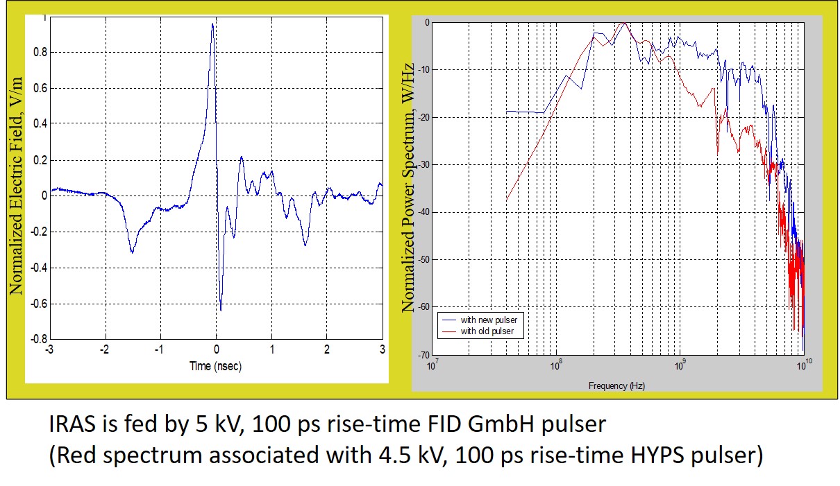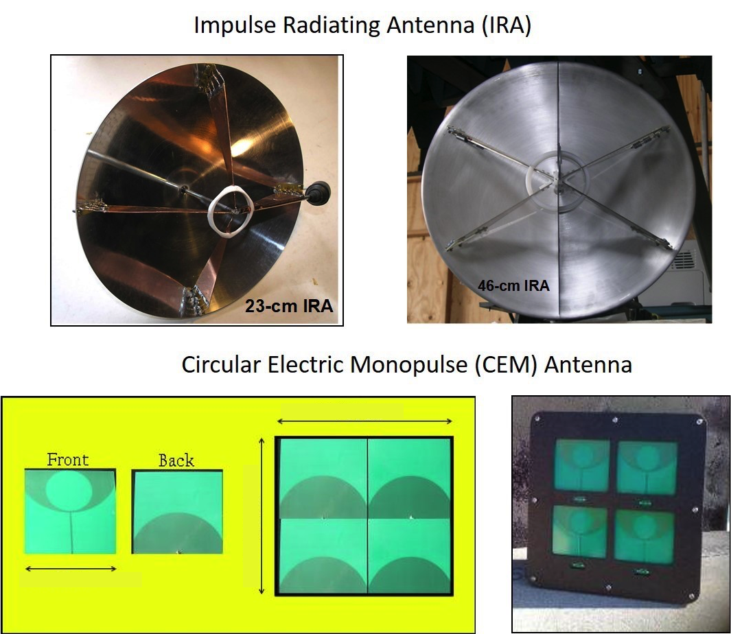 Impulse Radiating Antennas (IRAs) – IRAs are extremely broadband antennas consist of a parabolic reflector fed by a pair of transmission lines driven by a 100 ps rise time pulser. For these types of IRAs, the lower cutoff bandwidth occurs at fmin ~ c/2D, where c=3×108 is the speed of light, and D is the IRA dimension. For example, using a 23 cm IRA, we get fmin ~ 640 MHz. The IRA’s upper cutoff bandwidth, however, is inversely proportional to the rise time of the pulser and thus inversely proportional to the width of the impulse t, i.e. fmax ~ 0.35/t. Thus, using a 100 ps rise time pulse, we get fmax ~ 3.5 GHz, which yields the total signal bandwidth of approximately 3 GHz and thus reaching sub-inch resolution. It can be shown that IRA’s 3dB beamwidth is q3 ~ 2ct/D. For example, for 100 ps wide pulses and a 23 cm IRA, we have q3 = 0.26 rad corresponding to a 15 degree beam.